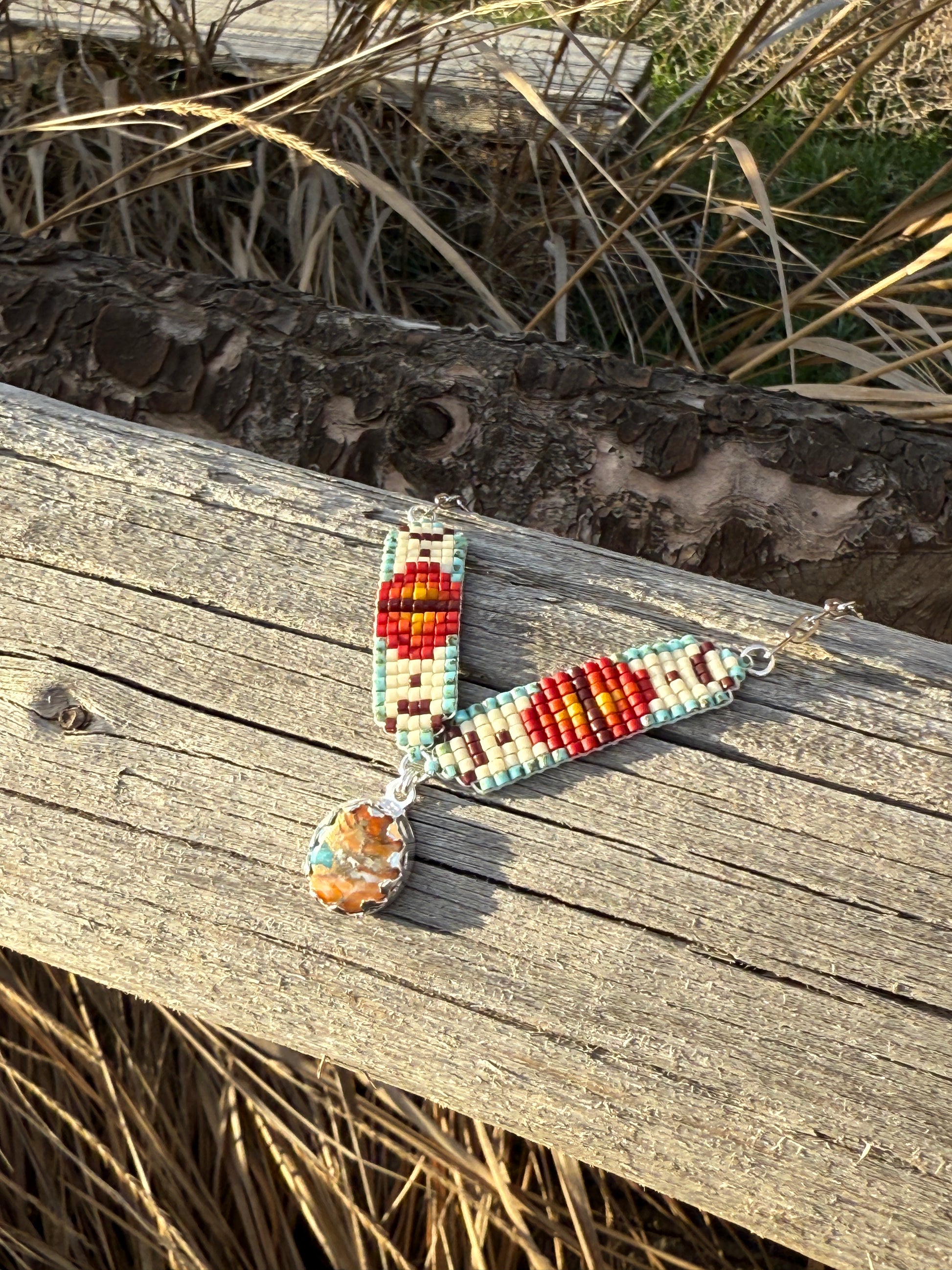 Designed for those who love Western-inspired elegance, the Mini Breast Collar Necklace blends handcrafted beadwork with a stunning oval Spiny Oyster and Turquoise pendant set in sterling silver. The rich, natural tones of this genuine turquoise stone make each piece one of a kind, capturing the timeless beauty of the desert.
